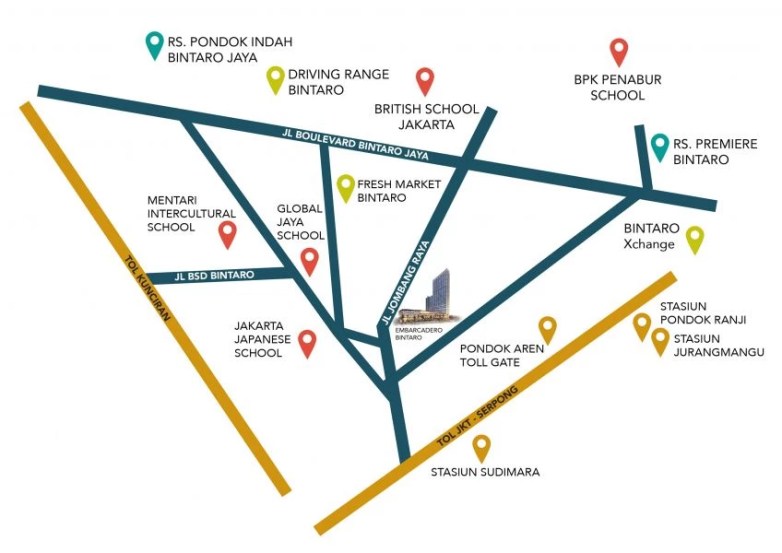 Embarcadero Apartemen The Connected District in Bintaro. Embarcadero merupakan apartemen premium yang terintegrasi dengan Lifestyle Mall seluas 35.000 m2. Apartemen ini dilengkapi Resort Style Country Club, heliport dan beragam Sky Private Facility.